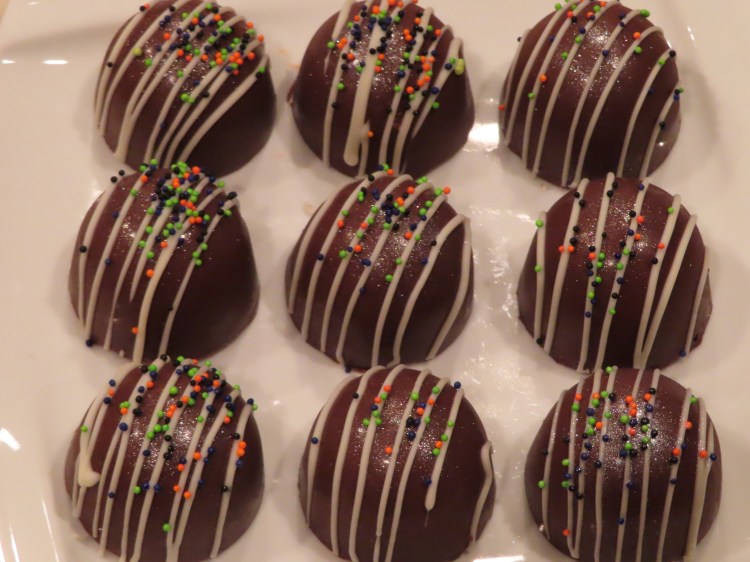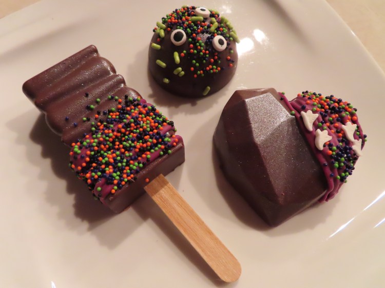 Our seasonal creations for Halloween and Fall season! Truffles, hot cocoa-bombs, and stuffed bears! Hot cocoa-bombs individually wrapped with seasonal cup is perfect for parties and gift giving.
