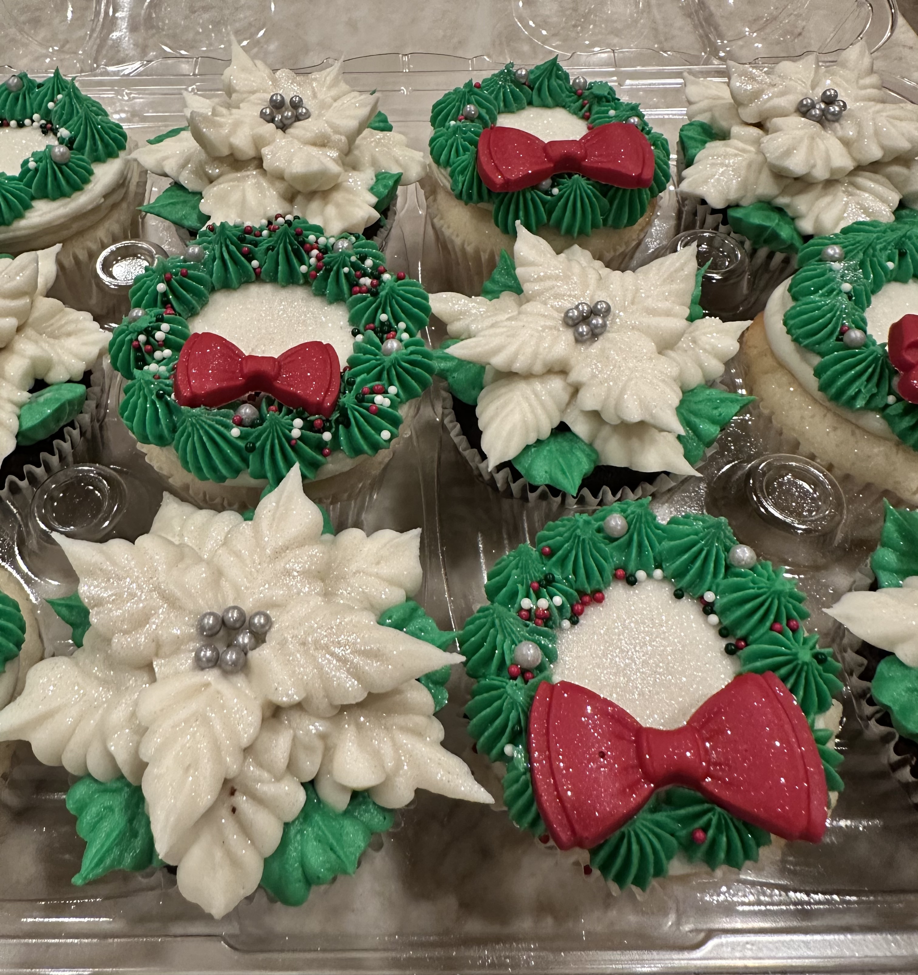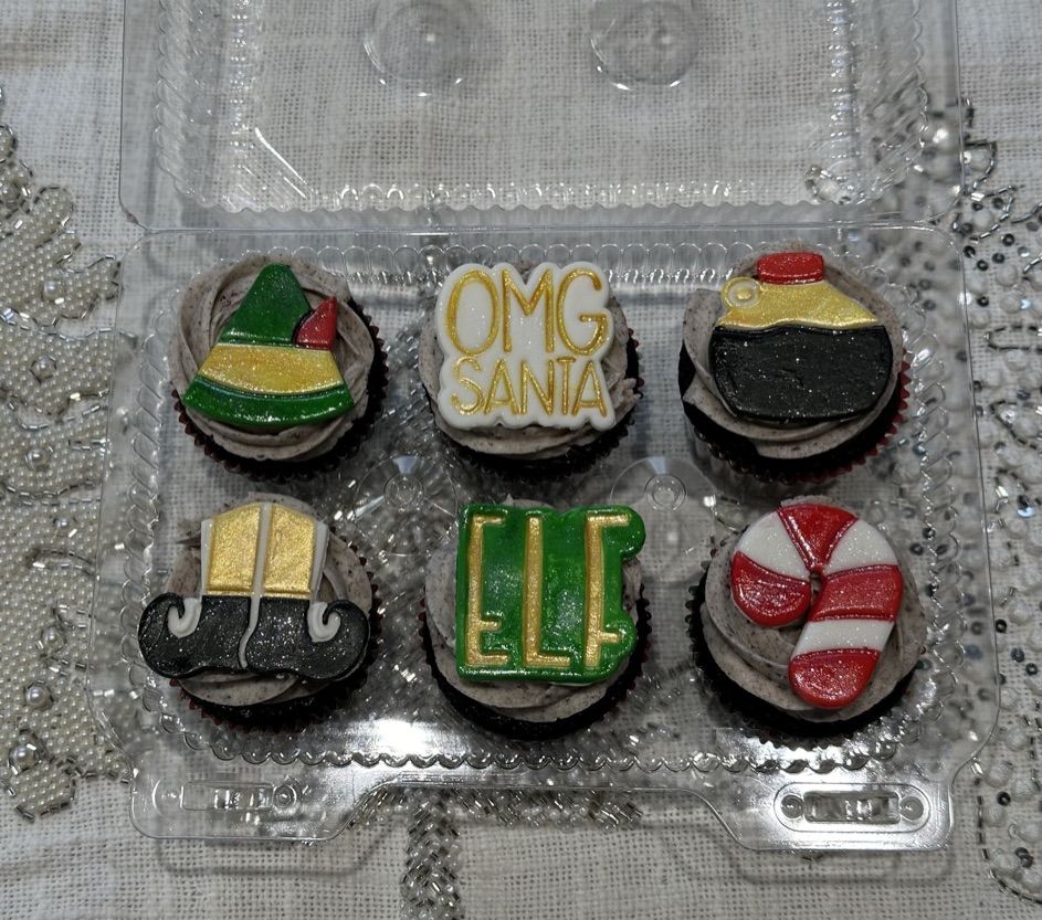 Check out this set of cupcakes we created for a customer’s work-party! Now offering Winter-themed cupcakes, from an Elf-themed set of Oreo cupcakes with custom home-made fondant toppers…and our chocolate cupcakes with vanilla buttercream in holiday shapes. Inquire about pricing for our cupcake sets this winter Holiday season, or other reasons to celebrate. If ordering for Christmas, Hanukkah, or even Festivus, get your orders in by Wednesday, December 13, 2023!