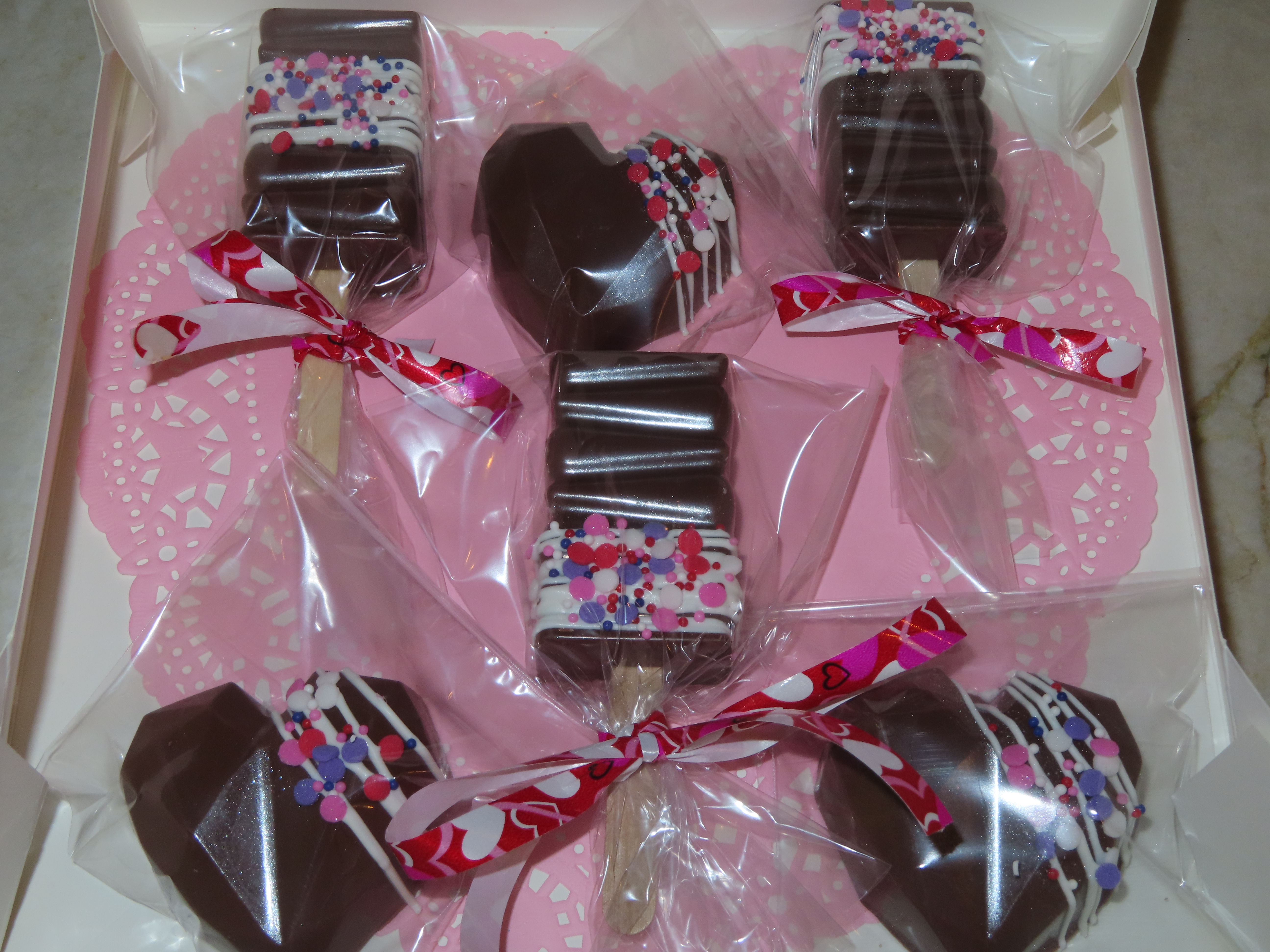 Cakesicles and Gems are typically filled with already baked cake, but we also offer brownie, truffle, and edible cookie dough fillings. They come in a variety of sizes, and shapes, on or off of a popsicle stick. You may also hear these referred to as, “Geo-Hearts,” “Cake Pops,” or “Chocolate-covered treats.” All of our treatsicles and gems are coated in your choice of milk, dark, or white chocolate.